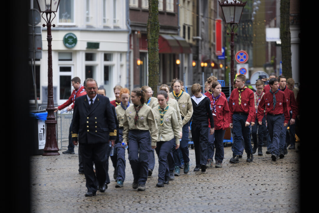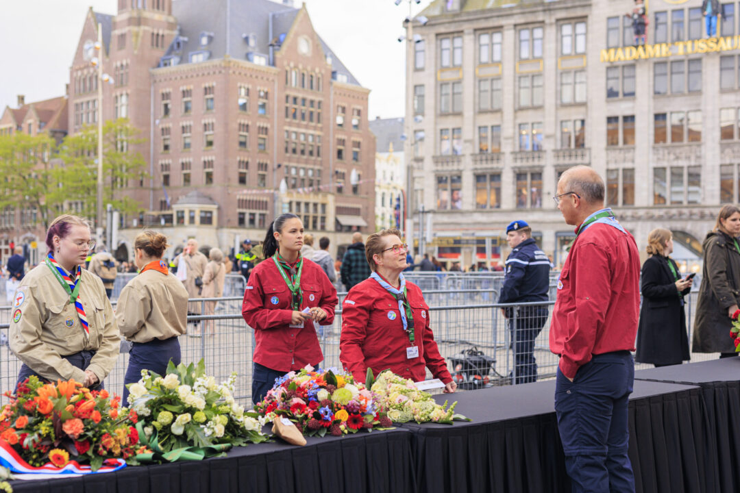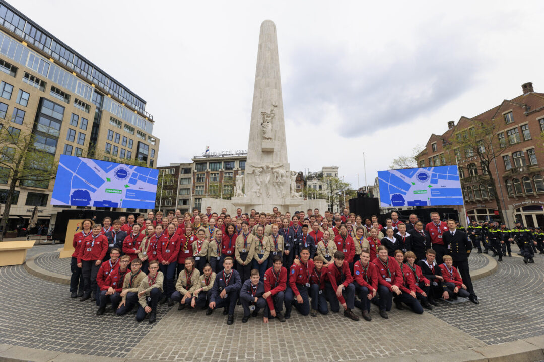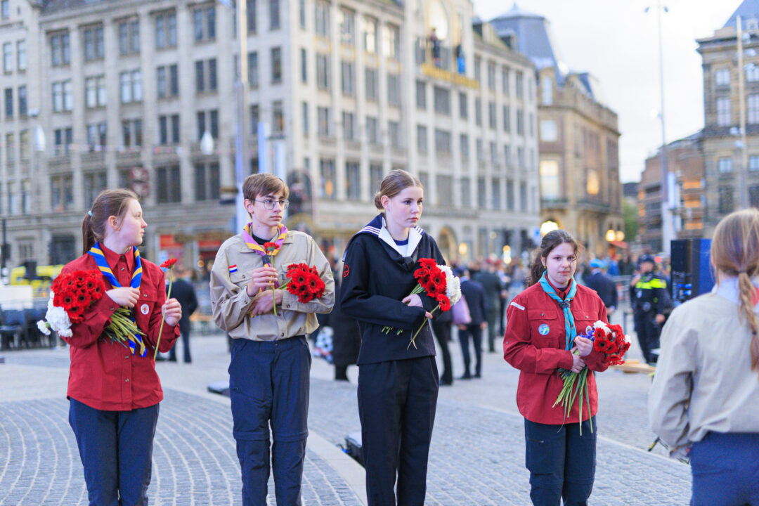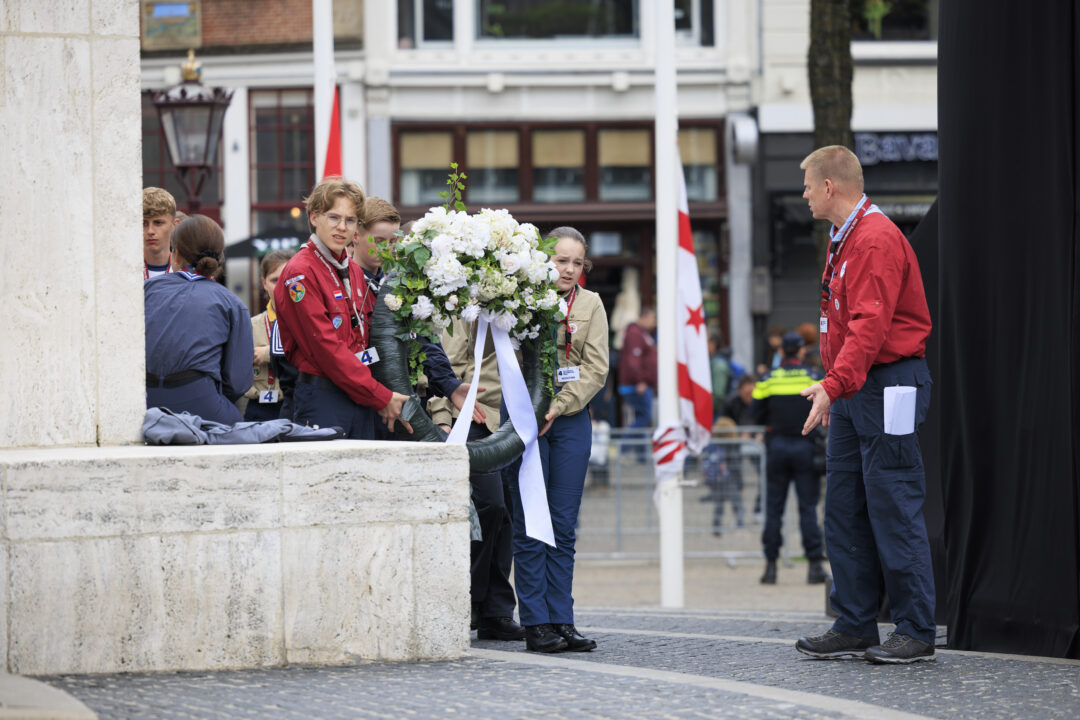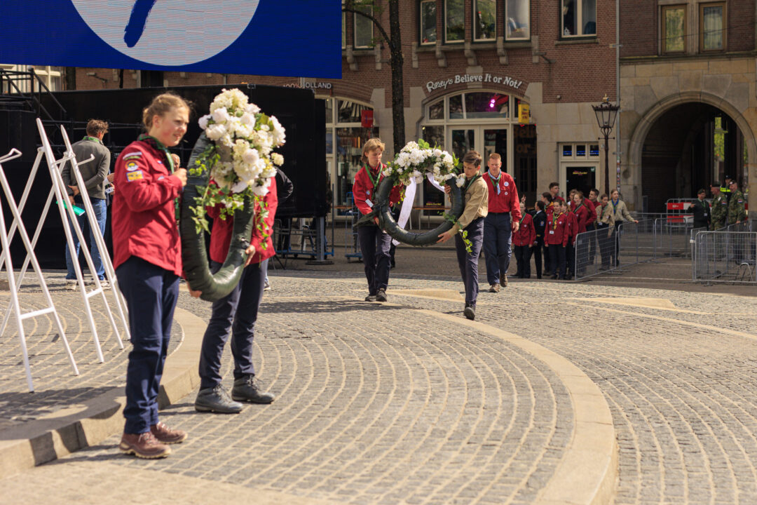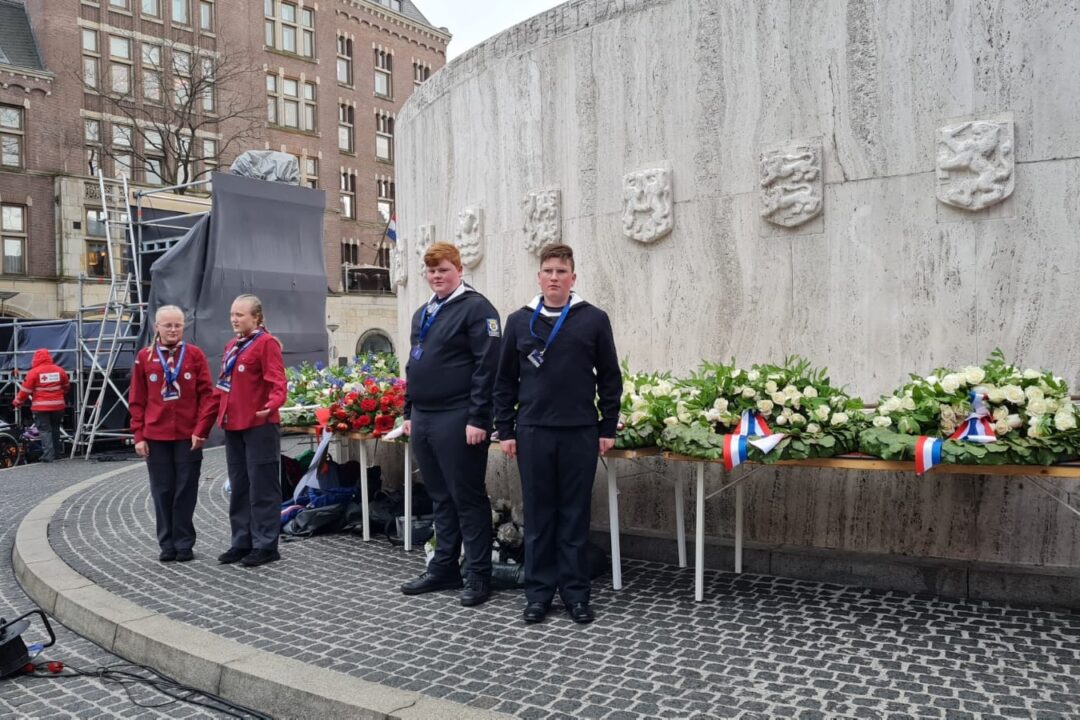 Ook dit jaar is de Nationale Herdenking op de Dam zonder publiek en dus is de inzet van scouts en zeekadetten beperkt. De scouts Cato (14) en Ana (16) Robben uit Leiden en de zeekadetten Mark (14) en Anne (16) den Dunnen uit Urk plaatsen de kransen namens de diverse organisaties. Ze hebben zich op hun taak voorbereid door enkele opdrachten met thema’s rondom de Tweede Wereldoorlog, vrijheid en herdenken uit te voeren. Daardoor zijn ze zich bewust van het belang van de herdenking en weten ze voor welke organisaties ze de kransen leggen. Op 4 mei overdag oefenen ze op de Dam de protocollen.