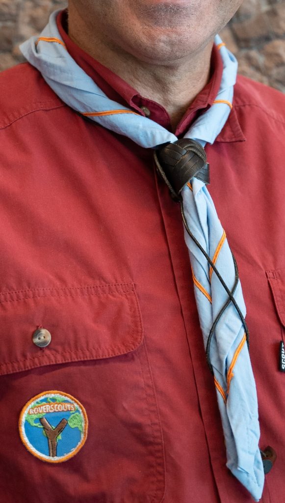 De das van de scouts is netjes opgerold, ligt op de kraag van het scoutfit en wordt vastgemaakt met de leren dasring van de scoutshop.