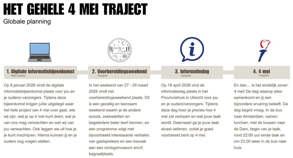 Scouts die wonen of lid zijn van een Scoutinggroep in de provincie Utrecht kunnen zich van 8 januari tot en met 25 januari inschrijven om deel te kunnen nemen aan de Nationale Herdenking op de Dam op 4 mei 2026.